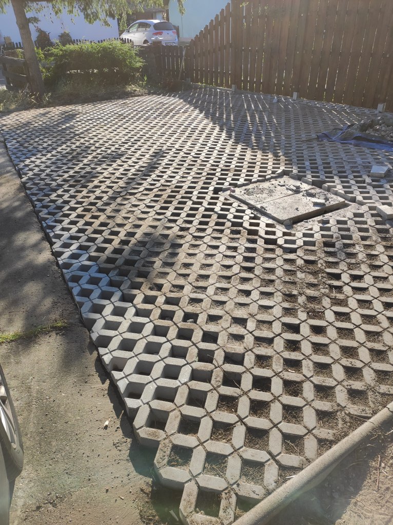 Ein Jahr später. Seit einem Jahr guckten wir dank der Entfernung der Hecke nicht nur auf Baumstümpfe, sondern auch auf den hässlichen Zaun, der unser Grundstück von dem unseres Nachbarn trennte. Beste Asbestplatten in Wellenoptik. In gelb-gräulich. Das musste geändert werden. Mit unserem Nachbarn einigten wir uns auf einen neuen Zaun, den wir gemeinschaftlich auch setzten. Dieses Projekt dauerte gefühlt den ganzen Sommer, aber am Ende stand ein hoher Holzzaun, den ich persönlich recht gemütlich anzusehen finde. Zusammen mit demselben Nachbarn liehen wir euch einen kleinen Mini-Bagger und begaben uns damit auf das bisher lustigste Abenteuer unserer Baustelle. Was für ein Spaß! Am Ende des Abenteuers war der Parkplatz um einige Zentimeter ausgehoben und eigentlich fast bereit für seine neue Füllung und Abdeckung mit Rasengittersteinen. Aber weit gefehlt. Irgendwie wurde es Herbst und Winter und Corona-Frühling und schon wieder ist ein Jahr vergangen. Inzwischen war die mühsam ausgehobene Fläche wieder komplett zugewuchert. Nun die große Frage: würden wir es in diesem Sommer schaffen, das Projekt zu beenden? Keiner war gespannter als ich. Leider erreichte mich alsbald auf dem heimischen Sofa die folgende WhatsApp-Nachricht vom Liebsten: „Was für eine Scheiße, wir kommen total langsam voran.“ Ohje, das klingt gar nicht gut.
