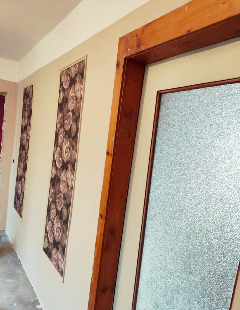 Wer jetzt glaubt, damit sei unser Task „Tapezieren“ bereits abgeschlossen, irrt. In der folgenden Nacht widmeten wir uns dem unteren Flur. Hier, zwischen Kaminzimmer, Wohnzimmer, Bad und schöner neuer Treppe möchte ich eine kleine Wartezone einrichten. Ich stelle mir vor, dass die künftigen Gäste sich hier treffen, wenn sie einen Ausflug vorhaben. Einige haben bis eben noch einen Bissen zu sich gekommen, einige müssen noch mal schnell pinkeln und andere kommen mit ihren Habseligkeiten von oben herunter. Sie treffen sich dann alle in der Mitte, nämlich im Flur. Nachdem die Treppe schon ein Träumchen à la Landhaus geworden ist, sollte nun auch die Wandgestaltung möglichst ländlich folgen. Als wir das Haus damals kauften, wollte ich die Wände eigentlich mit einer Art Täfelung versehen. Das hatte ich mal in einem Youtube-Video gesehen und es sah wirklich recht einfach aus. Aber inzwischen sind wir etwas realistischer als am Anfang unserer Arbeiten. Wir können unser Können auch etwas besser einschätzen. Also entschieden wir uns für eine echte Light-Version der Vertäfelung: einzelne Rahmen an der Wand, die allesamt in der gleichen Farbe wie die Wand übergepinselt werden und sodann den Eindruck einer Täfelung ergeben werden. Nunja. Ich dachte, es sei doch eine gute Idee, die Rahmen mit Tapete zu füllen. Hübsch würde das aussehen. Und praktisch gar kein Aufwand sein. Wir legten also los. Bereits am vergangenen Wochenende hatten wir markiert, wo die Rahmen platziert werden sollte. Insgesamt vier Stück sollten Platz im Flur finden. Vor der Ankunft der schwesterlichen Familie hatten wir die Leisten, aus denen die Rahmen zusammengesetzt werden sollten, gekauft und lackiert. Nun würden wir die Tapetenbahnen anbringen, welche im Anschluss gerahmt werden sollten. Danach würden die Rahmen und die Wandfarbe folgen. Easy. Ein Rahmen würde also genau 53,5 cm bereit sein müssen – so breit wie eine Tapetenbahn. Oben abschließen sollten sie auf Höhe des Türrahmens. Wie gesagt, waren die Vorbereitungen bereits gelaufen und wir mussten nur noch Tapete schneiden und an die aufgezeichneten Linien kleben. Die erste Bahn war wie immer kein Problem. Die zweite Bahn wurde gegenüber der ersten Bahn angebracht. Während Roman schon die Wand einkleisterte, wo die dritte Bahn ihren Platz finden sollte, bewunderte ich unser Werk.