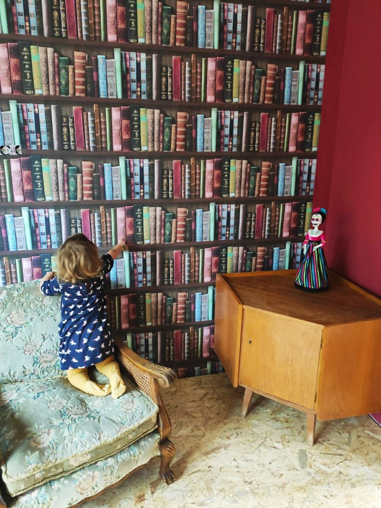 Der Sohn ist jetzt übrigens der Alleinerbe. Ich küsste sein goldenes Haar und setzte die heulende Tochter ab. Um ein hübsches Insta-Foto zu machen, schleppten Roman und ich (er ist in guten Momenten wirklich Gold wert, keine Frage) einen kleinen Retro-Sessel ins Zimmer und platzierten ihn vor der Tapete. Die heulende Tochter stieg drauf und griff nach einem aufgemalten Buch. Ging nicht. Sie teilte mir mit, ich solle ihr nun ein Buch vorlesen und zwar das Blaue. Ich erklärte, dass die Bücher nur zum Ansehen da seien und man sie nicht lesen könne. Es folgte ein weiterer epochaler Wutanfall, in dessen Verlauf die Tochter die mühsam angeklebte Tapete beinahe wieder von der Wand riss. Ts, ts, von wem sie das bloß hat…