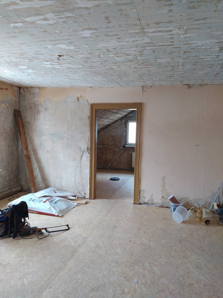 Ihr erinnert euch: Der Dachdecker hat bereits vor dreißig Jahren das Dach auf Omas Haus gedeckt und erinnerte sich in allen möglichen Einzelheiten an sein Werk aus grauer Vorzeit. Nun wollen wir ihn erneut anheuern und baten um ein Angebot für sechs neue Dachfenster. Als er kam (pünktlich!), ging er zielstrebig ins erste Zimmer. In dem Zimmer sieht es im Moment nicht besonders gemütlich aus, das müssen wir zugeben. Entsprechend zweifelnd sah sein Gesicht aus. „Was soll das werden?“, fragte er. Ich grübelte kurz, ob er die Frage im großen Ganzen stellte oder sich nur auf das Zimmer bezog. „Das Kinderzimmer.“, sagte ich kurzentschlossen.