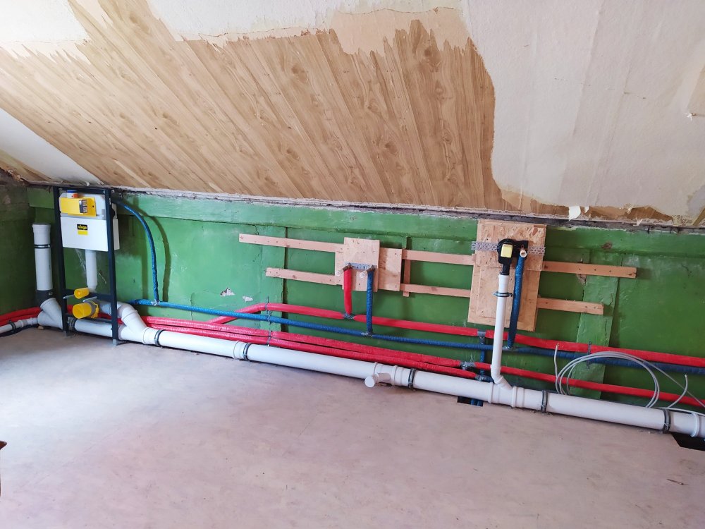 Die Sanitärfachleute, von denen wir eine ganze Weile lang glaubten, sie würden sich niemals mehr melden, verrichteten ihr Werk ebenfalls zügig. Innerhalb von nur einer Woche verlegten sie die gesamte Rohmontage im künftigen Badezimmer. Großartig!