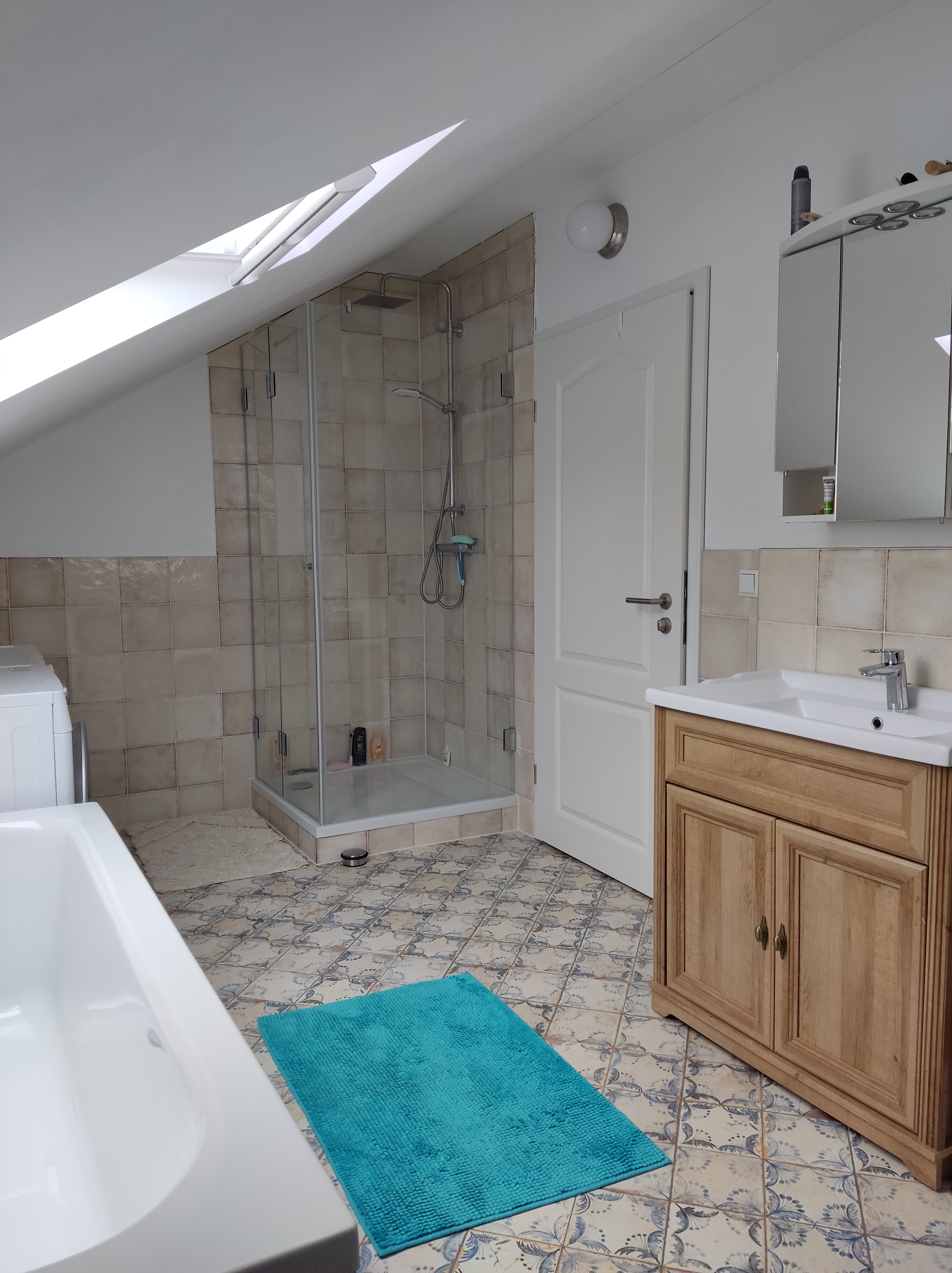 Für das Bad haben wir uns dann ein paar Profis gegönnt. Sanitär- und Fliesenfachleute habe ich in den vorigen Artikeln schon vorgestellt und sie werkelten sich allesamt tapfer durch die Baustelle. Während wir aber bei den Sanitärleuten noch – nur ein kleines bisschen abfällig – dachten, das hätten wir sicher zur Not auch selbst hinbekommen, mussten wir spätestens beim Fliesenleger kapitulieren. Hier zeigte sich dann mal, warum das ein Lehrberuf ist und man zwar laienmäßig tatsächlich das meiste hinbekommt, aber ein Profi eben um Längen besser ist. In nur zwei Tagen verlegte er Boden und Wände, berechnete die nötigen Unterschiede in der Dicke der Fugen, die er auf den gegenüberliegenden Wände benötigte, um den nicht ganz geraden Boden auszugleichen und flieste uns die selbst gewählten Fliesen in einer Affenschnelligkeit an die Wände. Und dort hängen sie nun und erfreuen mich täglich.