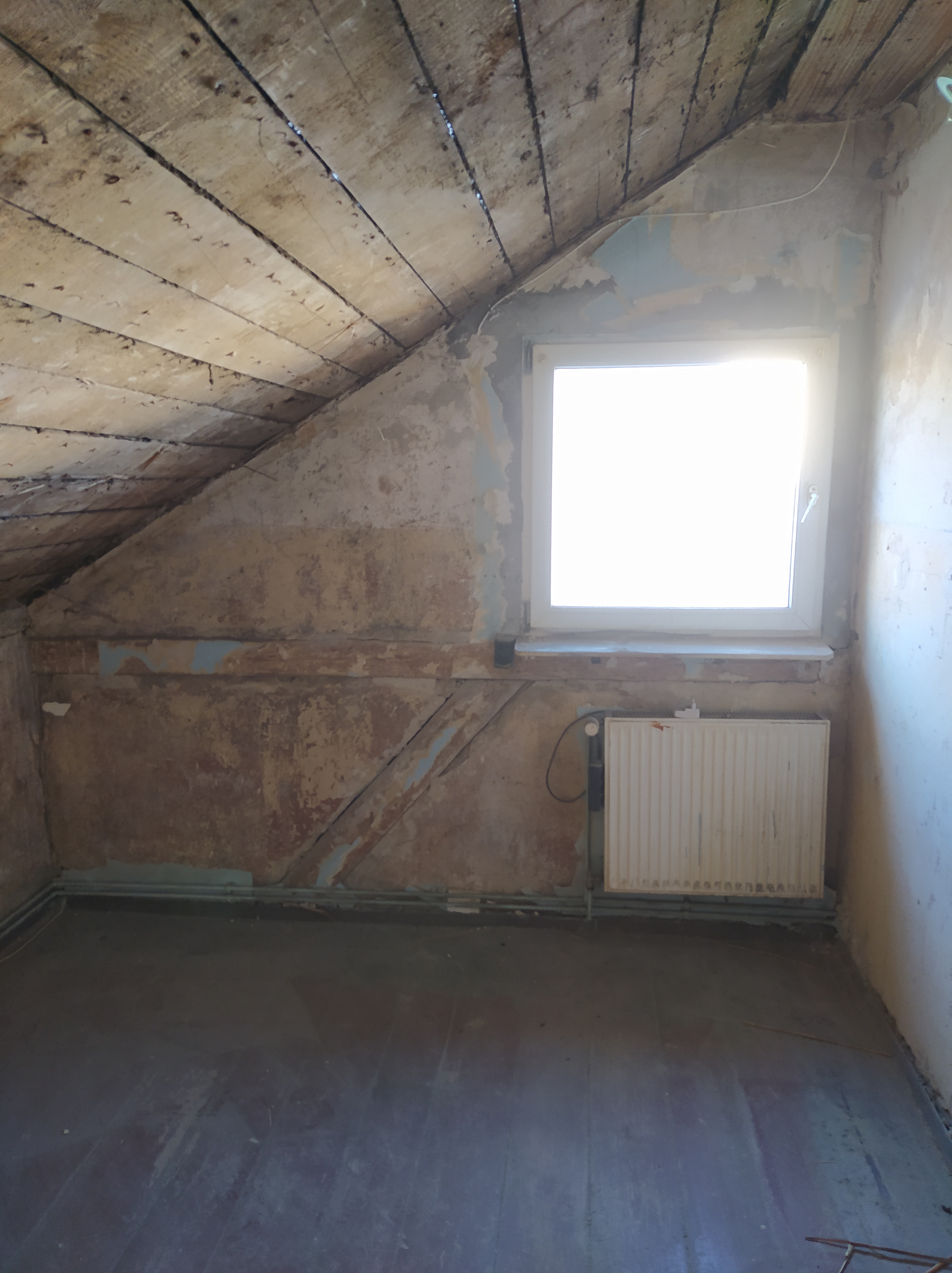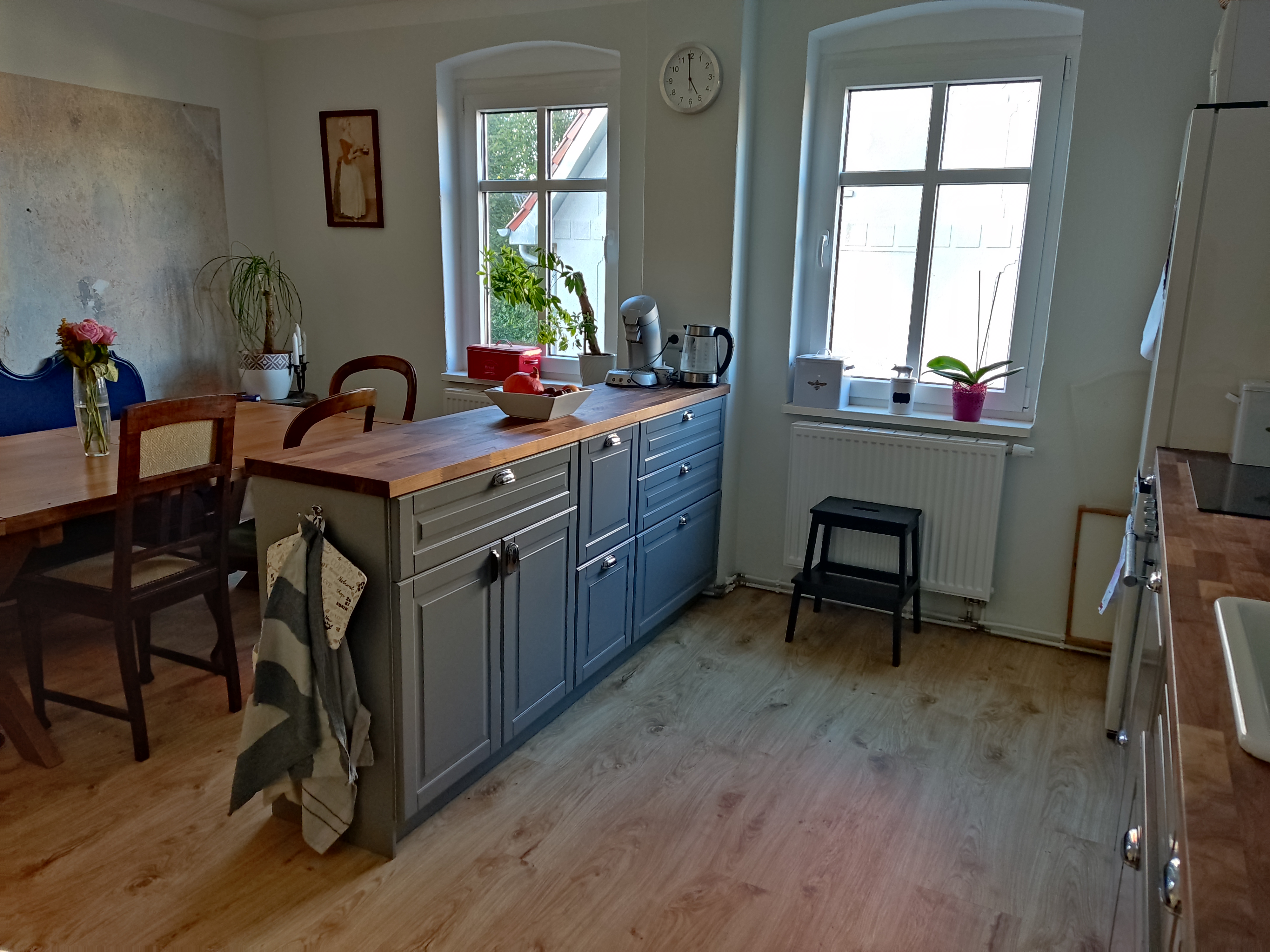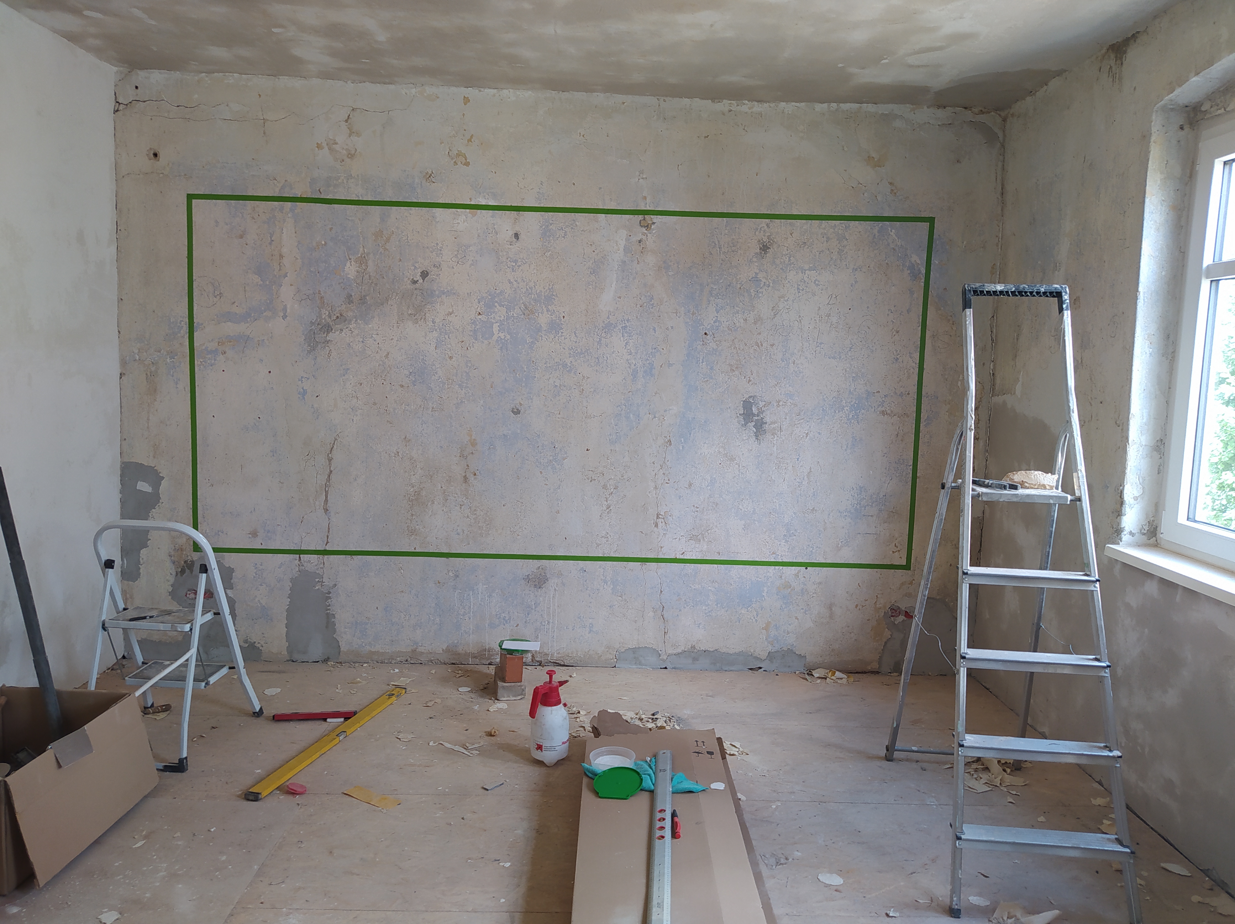Die zweite Polarisierung trifft man dann nur einen Raum weiter, nämlich in der Küche. Die ist eigentlich wenig spektakulär. Unsere dritte Küche innerhalb weniger Jahre, die wir bei Ikea gekauft haben. Nur die Farben ändern sich. Hier stehen sich zwei kleine Küchenzeilen gegenüber und daneben befindet sich der Essbereich. Großer Tisch, ein paar Stühle, ein hübsches Gründerzeit-Sofa, wie ich es mir schon immer in der Küche gewünscht hatte. Aber dann! Hinter dem hübschen Sofa scheint sich für manche Besucher (nicht zuletzt meine Mutter) die absolute Todsünde der Wandgestaltung zu befinden: eine unverputzte Wand. Sie ist eigentlich nicht komplett unverputzt. Ich habe ein großes Rechteck abgeklebt, das ich mein „historisches Fenster“ nenne und das die Wand in seiner ursprünglichen Version zeigt einschließlich der Reste der einhundert Jahre alten blauen Farbe. Oben und unten sowie links und rechts ist die Wand verputzt. Auf Instagram würde ich die Wand einfach raw nennen, aber damit brauche ich meiner Familie nicht zu kommen. „Nicht fertig“ nennt die die Wand nämlich und ganz unrecht haben sie ja damit auch nicht. Eigentlich wollten wir nämlich mindestens noch irgendeine Art Grundierung oder whatever draufpinseln, damit einem die einhundert Jahre alte blaue Farbe nicht in die Haare rieselt, wenn man unbedacht mal zu heftig mit den Armen am Frühstückstisch wedelt. Aber dazu wird es nun niemals kommen. Wir haben ja keine Zeit.
